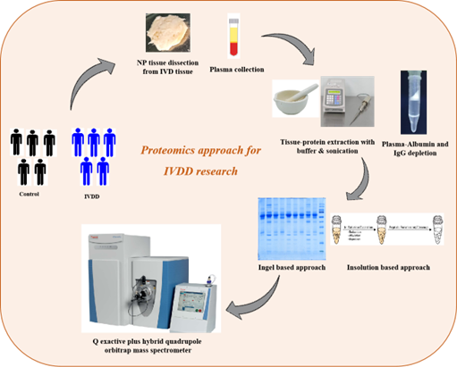 Research at proteomics involves analysis and identification of disc tissue and plasma proteins from intervertebral disc degenerative patients. Our work flow involves extraction of proteins from the disc tissues. Plasma proteomics involves depletion of top two abundant proteins including albumin and IgG which mask the identification of low abundant proteins using depletion kits. We employ in-gel or in-solution based tryptic digestion for mass spectrometric identification of disc tissue and plasma proteins. The figure below denotes the workflow followed for proteomics approach to understand IVDD.