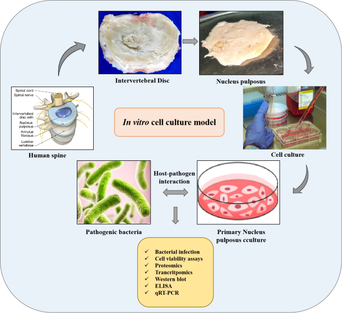 Intervertebral disc degeneration causing low back pain is the frequent disease and individual at any age may suffer with this disease. IVD is composed of three main components including nucleus pulposus (NP), annulus fibrosus (AF) and cartilage end plate (CEP). Disc degeneration is caused by various factors and GOREF hypothesize subclinical infection mediated disc degeneration based on the research carried out in proteomics and metagenomics. Our metagenomics study revealed the identification of several pathogenic bacteria from degenerated discs. The cell culture intends to study the interaction of the pathogenic bacteria with the cultured primary nucleus pulposus cells. The interaction and the pathogenic virulence would be assessed by checking cell viability, expression of ECM markers, inflammatory markers and apoptotic markers as well by OMICS approach after infection.