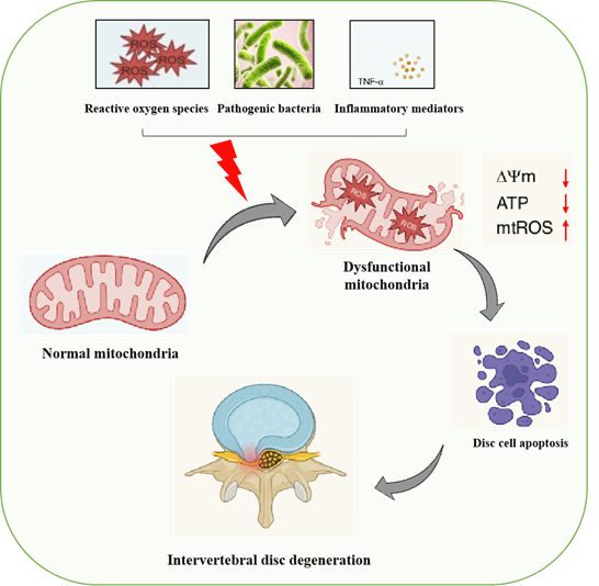 Mitochondria are dynamic organelles and are the centre hub for cellular energy. Its function includes reactive oxygen species production, metabolism, and energy production, cellular apoptosis, and mitophagy, which makes them an important organelle for normal physiological functions. Mitochondrial dysfunction are associated with various pathological conditions, including IVDD. Oxidative stress, inflammatory mediators, and subclinical infection, during IVDD, cause mitochondrial dysfunction. This leads to imbalance mitochondrial dynamics and impaired mitophagy, results in the accumulation of damaged mitochondria inside the disc cell and causing apoptotic death of disc cells. Using in vitro model systems, the effect of ROS, inflammatory mediators, and bacterial pathogens in nucleus pulposus primary cultures and degenerated tissues will be assessed to understand the pathogenesis of IVDD mediated by mitochondrial dysfunction.
