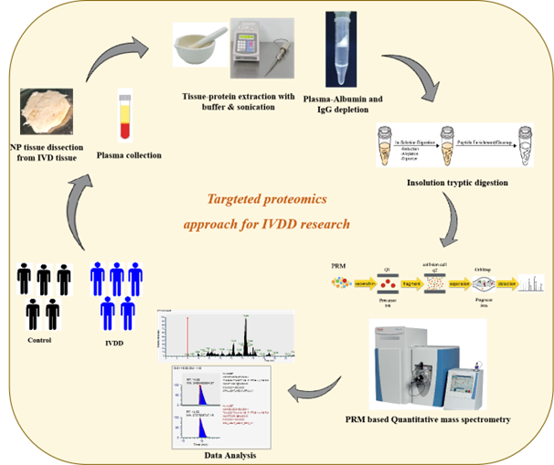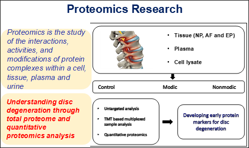 Research at proteomics involves analysis and identification of disc tissue and plasma proteins from intervertebral disc degenerative patients. Our work flow involves extraction of proteins from the disc tissues. Plasma proteomics involves depletion of top two abundant proteins including albumin and IgG which mask the identification of low abundant proteins using depletion kits. We employ in-gel or in-solution based tryptic digestion for mass spectrometric identification of disc tissue and plasma proteins. The figure below denotes the workflow followed for proteomics approach to understand IVDD.