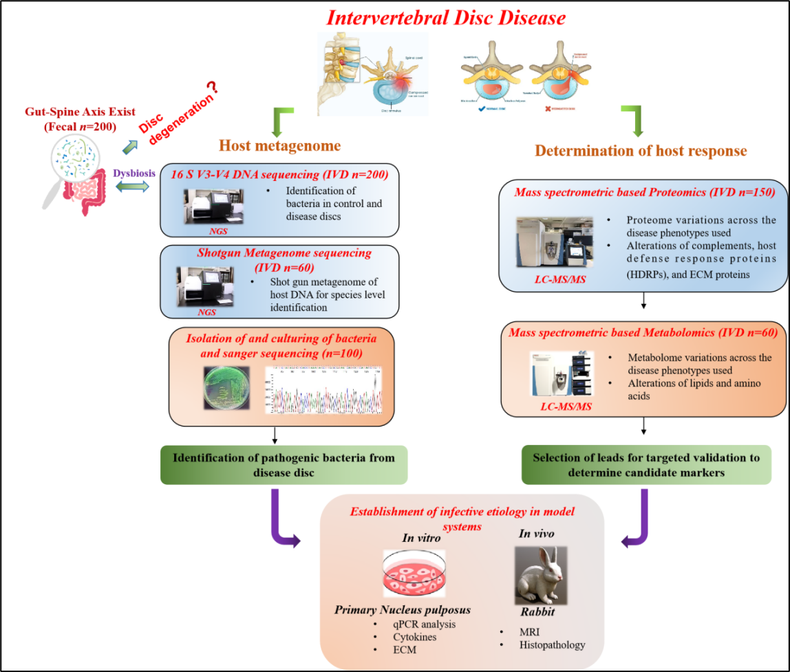 Spine research is a multidisciplinary field focused on understanding, treating, and preventing spinal disorders through advanced science and technology. Healthy spine is imperative to lead a healthy life. Combating various spinal issues at the early stage has a huge impact and possible to reverse back to normal conditions. The "omics" approach has revolutionized spine research by providing a comprehensive, system-level understanding of conditions like spinal cord injury (SCI) and intervertebral disc degeneration (IDD). The term omics refers to the holistic characterization of all genes (genomics), lipids (lipidomics), metabolites (metabolomics) or proteins (proteomics). Low back pain (LBP) is the prevalent cause of musculoskeletal disorder and years lived with disability. Systemic analysis of Global Burden of Disease study 2021 states that 619 million people are affected with LBP and the number will be projected to increase by 843 million by 2050. Intervertebral discs (IVDs) is an essential component of the human spinal cord, crucial for maintaining health and well-being. Disruptions to IVD integrity can lead to a variety of health issues. Low back pain (LBP) is a prevalent non-communicable disease affecting a significant portion of the global population, imposing a substantial economic burden and negatively impacting quality of life. Intervertebral disc degeneration (IVDD) is a major contributor to LBP. Factors such as aging, physical stress, and systemic inflammatory disorders can accelerate IVDD. As this condition often presents asymptomatically, its progression is not well-understood. Current treatment advances from pain management to spinal fusion and spinal arthroplasty yet there is no clinically proven biological therapy for disc complications since there is limited information on the biochemical/molecular changes leading to DDD. Unravelling biochemical/molecular complexity of DDD would lead to early diagnosis and effective treatment of DDD. Our focus relies on improving the knowledge on genetic and molecular basis of intervertebral disc degeneration leading to low back pain (LBP), which with the help of OMICS approach would assist the discovery of biomarkers for the prognostic approach of the disease. OMICS approach aids in documenting the changes at cellular, molecular and biological level to find the ‘true’ initiating factor of disc degeneration. To investigate the potential role of microbial dysbiosis in IVDD, we propose to employ genomics, proteomics, metabolomics approaches, in vivo and in vitro model systems. By studying the microbial community within the disc, GOREF aim to establish a potential infectious etiology of disc degeneration.